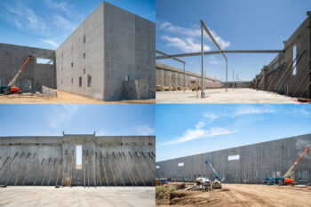 A modern, multi-building industrial campus photographed across daylight, twilight, drone, and interior perspectives, with an emphasis on truck court depth, efficient loading lines, and regional access to major transportation corridors.